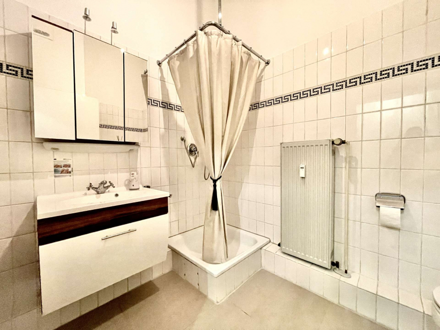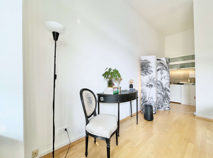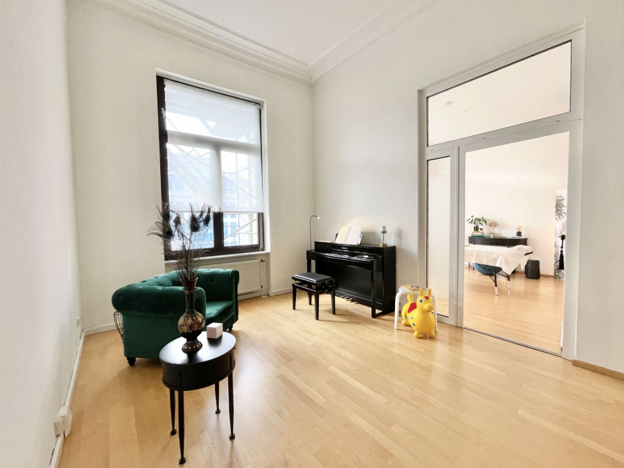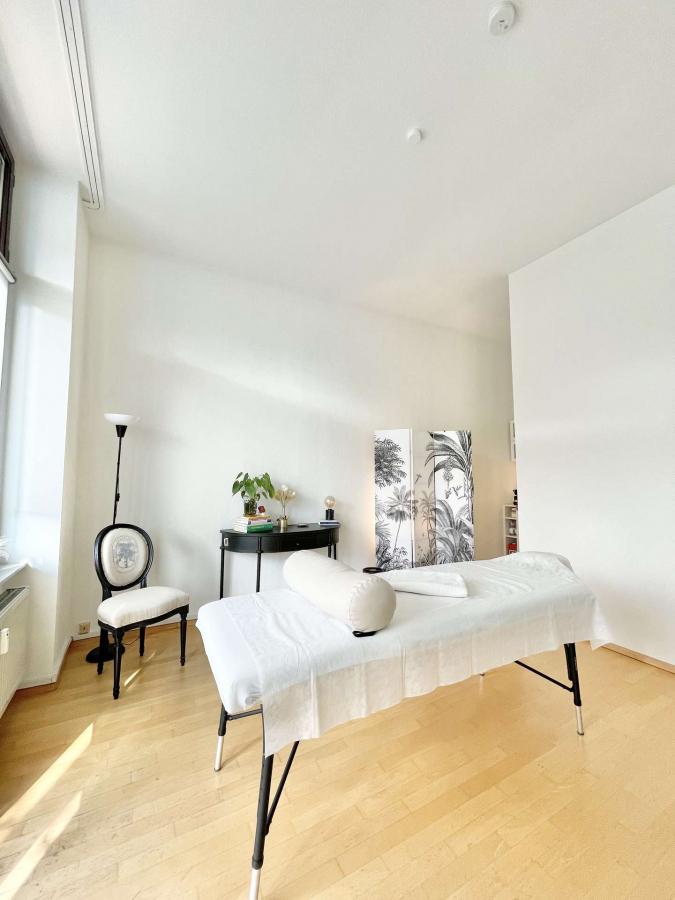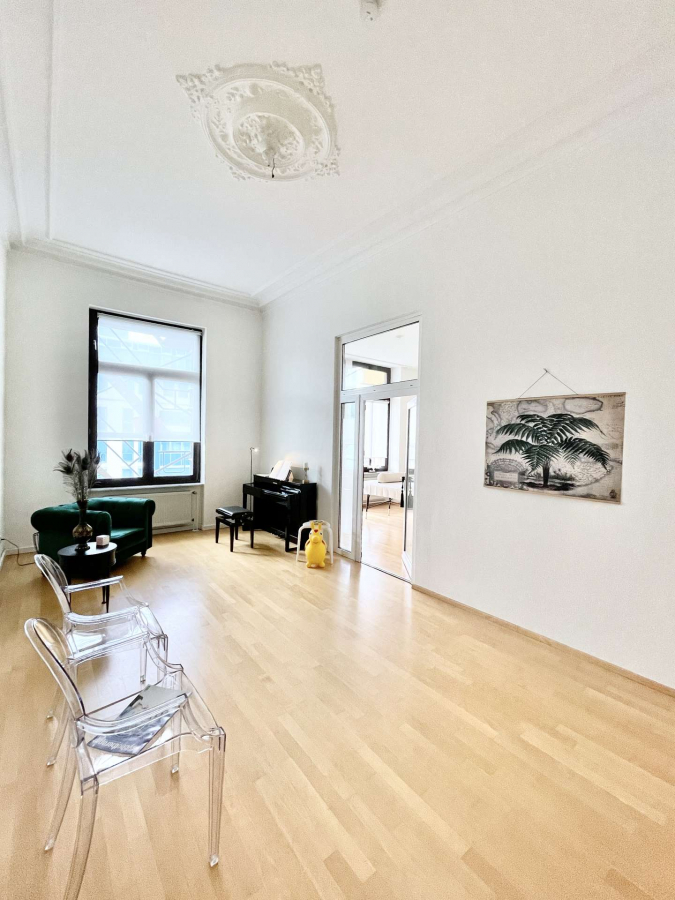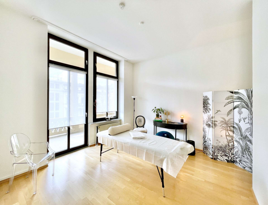 Die Praxis ersteckt sich über einen Flur, zwei helle Behandlungsräume mit hohen Decken, die durch eine Glastür miteinander verbunden sind sowie einem Duschbad. Im Ersten, etwas größeren Raum befinden sich schöne Stuckelemente. Vom zweiten Behandlungsraum gelangt man auf den Balkon, als auch in eine Nische mit einer Pantryküche.