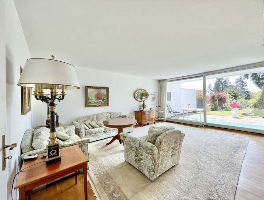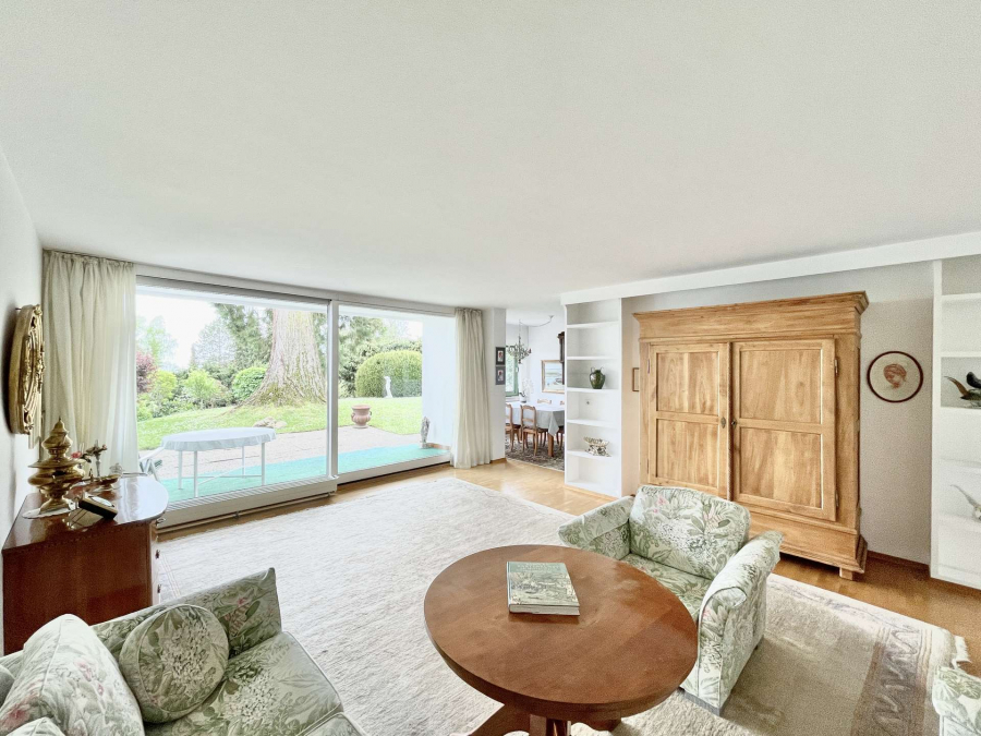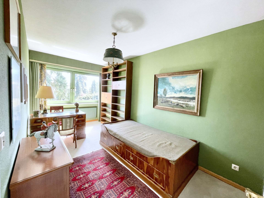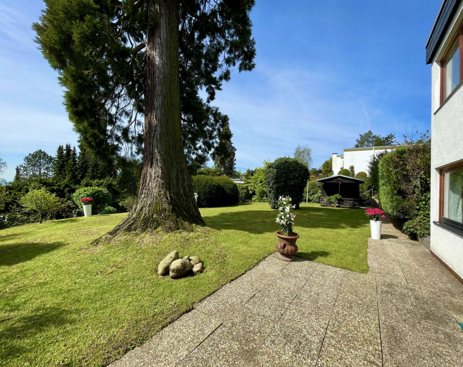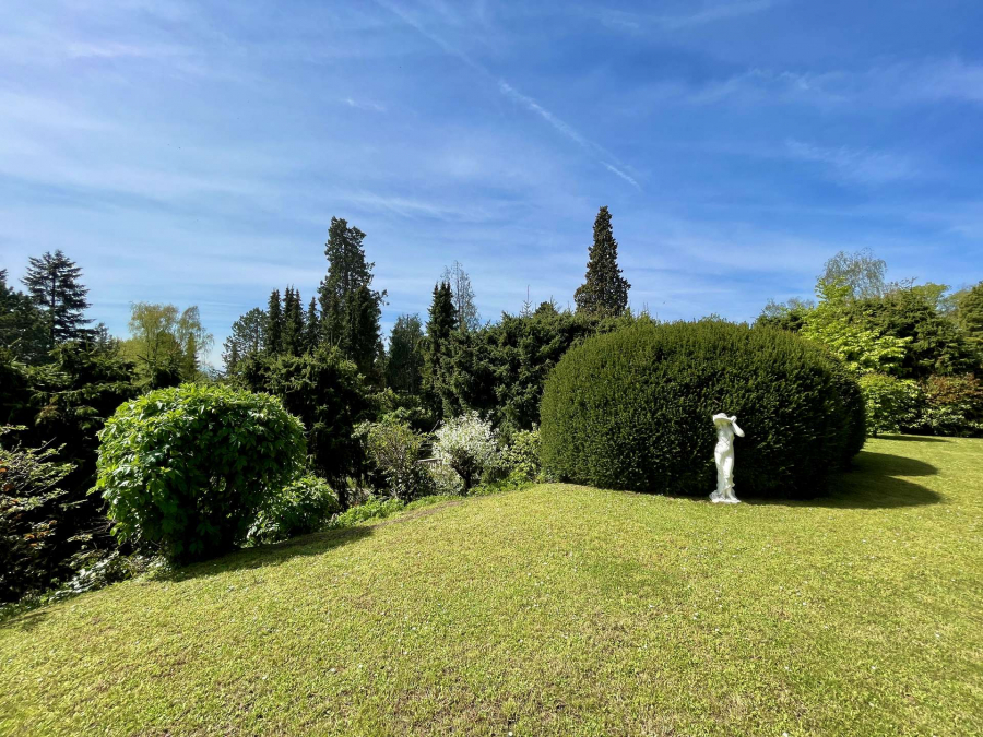 Im Erdgeschoss befindet sich ein großes lichtdurchflutetes Wohnzimmer mit angrenzendem Essbereich, eine Küche, ein Flur, ein Arbeitszimmer, ein Gäste-WC sowie ein Hauswirtschaftsraum. Der vom Wohnzimmer zugängliche wunderschöne Garten mit einer Südterrasse ist hochwertig angelegt und lässt das Herz von Naturliebhabern höher schlagen. Von mehreren Wohnräumen lässt sich der großartige Ausblick auf das tolle Grundstück genießen.