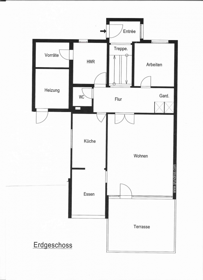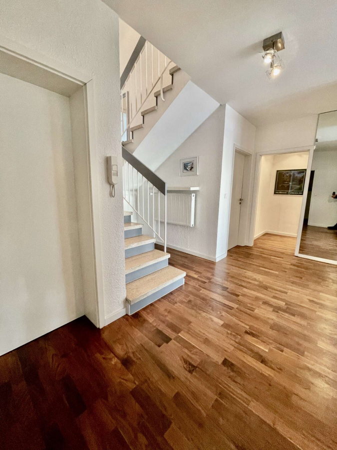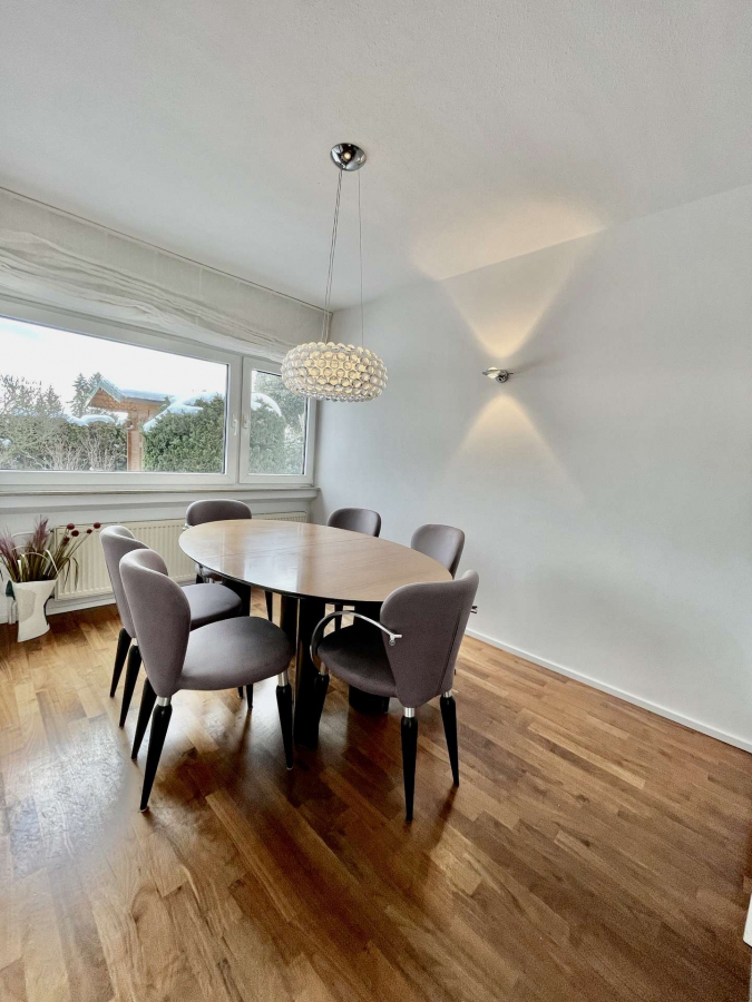 Im Erdgeschoss befindet sich ein großes lichtdurchflutetes Wohnzimmer mit angrenzendem Essbereich, eine Küche mit Einbauküche, ein Arbeitszimmer, ein Gäste-WC, eine Garderobe, sowie ein Hauswirtschafts- und Vorratsraum.