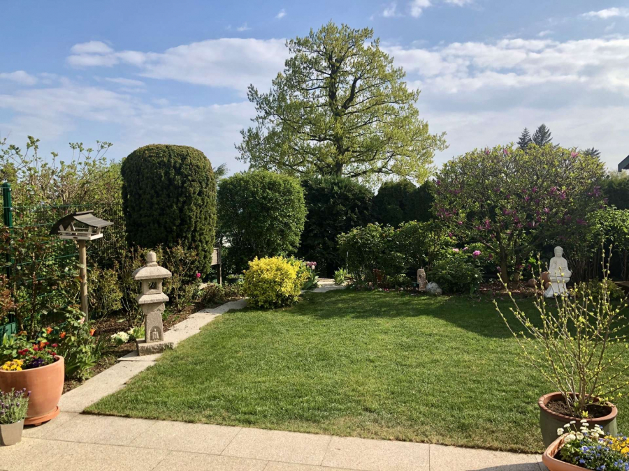 Der vom Wohnzimmer zugängliche eingewachsene, idyllische Garten mit Terrasse und Außensauna lädt förmlich zum Verweilen ein.