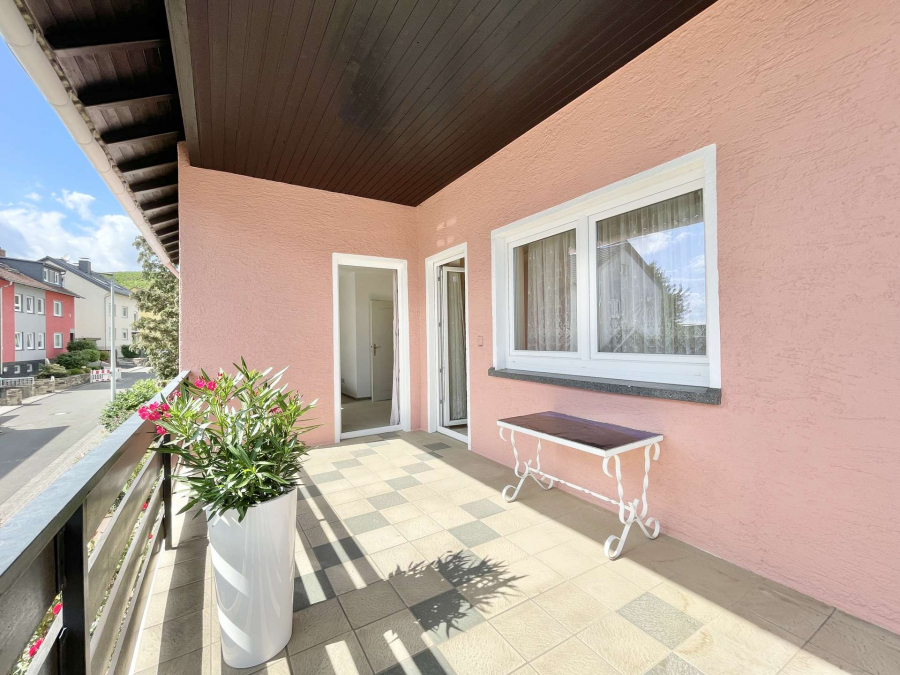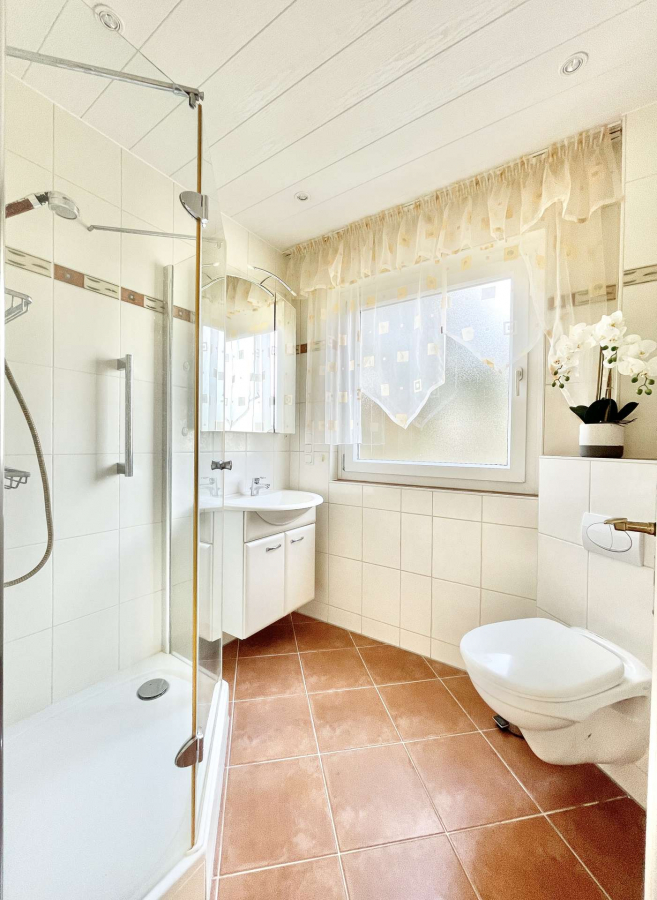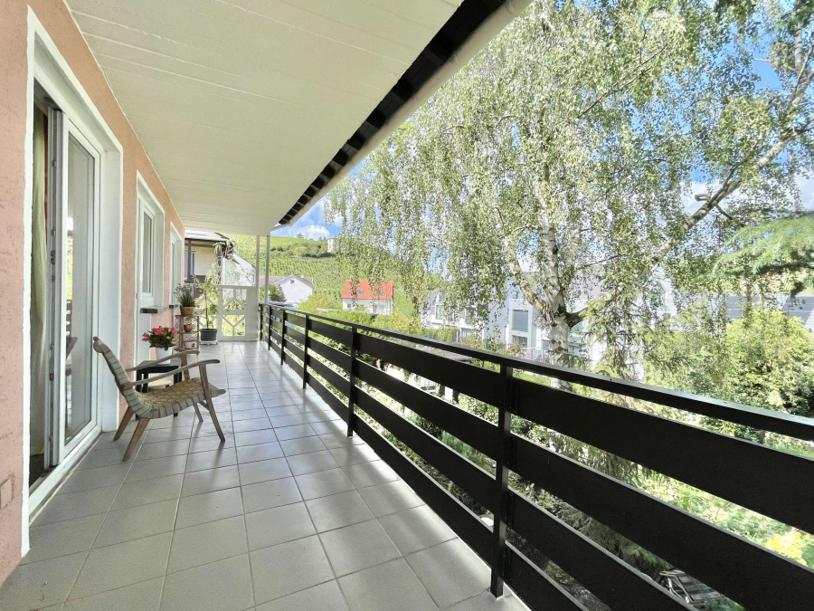 Eine gut begehbare Treppe führt in das lichtdurchflutete Obergeschoss. Dort befinden sich ein sehr geräumiges Elternschlafzimmer und zwei Kinderzimmer. Zwei Räume verfügen über einen Zugang zum Balkon, von dem man einen wunderschönen Ausblick in die umliegenden Weinberge genießen kann. Das dritte Zimmer auf der Etage verfügt über eine eigene Terrasse von ca. 14 Quadratmeter. Ein weiteres Tageslichtduschbad befindet sich ebenso auf dieser Wohnebene.
