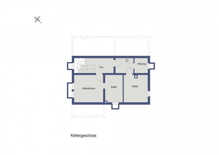 Im Kellergeschoss sind zwei Kellerräume, ein großer Abstellraum, eine Waschküche und der Heizraum zu finden.