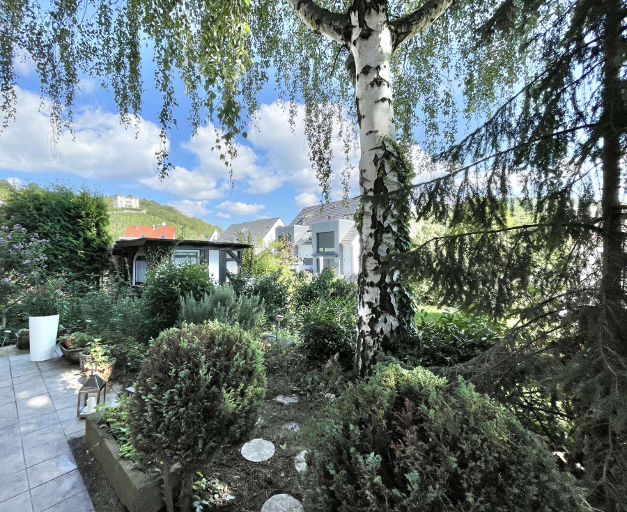Der Außenbereich ist liebevoll angelegt und verursacht durch die großzügigen Terrassen einen überschaubaren Pflegeaufwand.