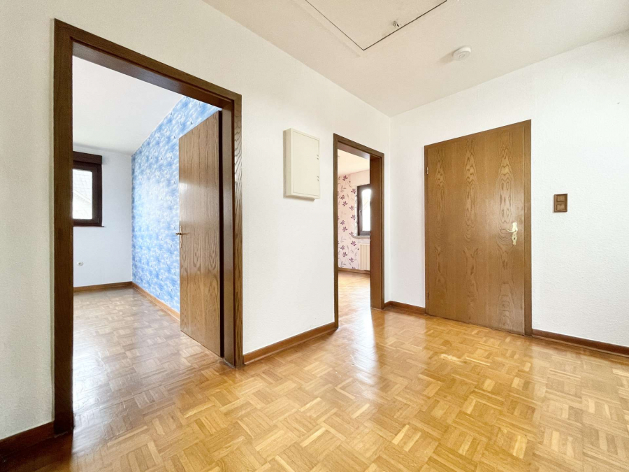 Im Dachgeschoss befindet sich der private Bereich der Familie. Dort existieren drei Schlafräume und ein Tageslichtbad mit Badewanne. Eines der Zimmer eignet sich perfekt als Homeoffice.