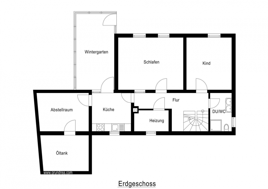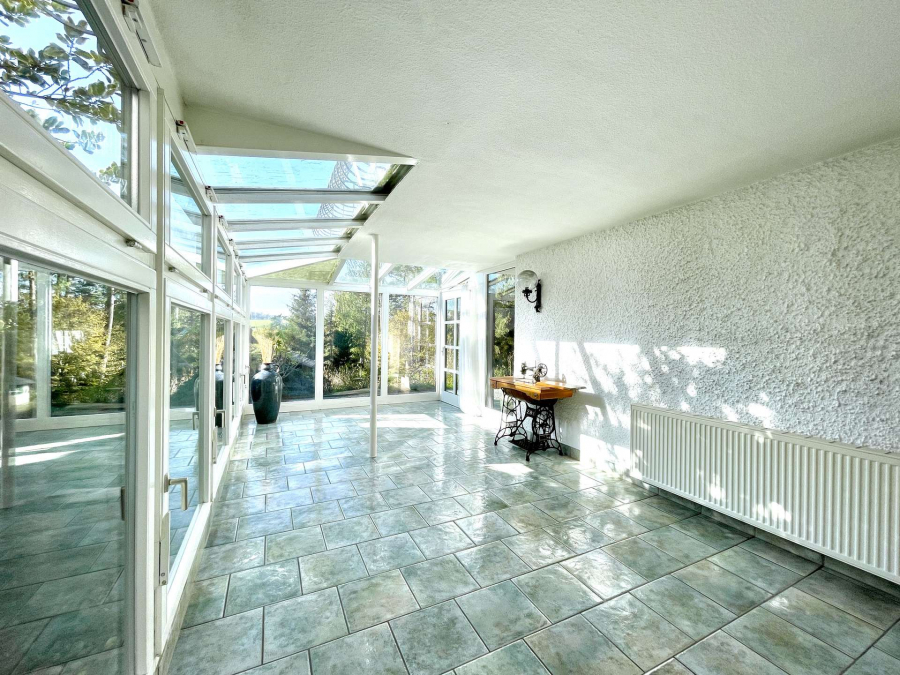 Vom Flur aus gelangt man über eine gut begehbare Treppe in das Erdgeschoss. Dort befindet sich ein großer Schlafraum, ein Kinderzimmer oder Homeoffice mit Zugang zu der großen Südwest-Terrasse, ein Duschbad sowie eine Küche, an die der 2010 erbaute und beheizte Wintergarten angrenzt.