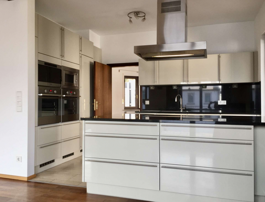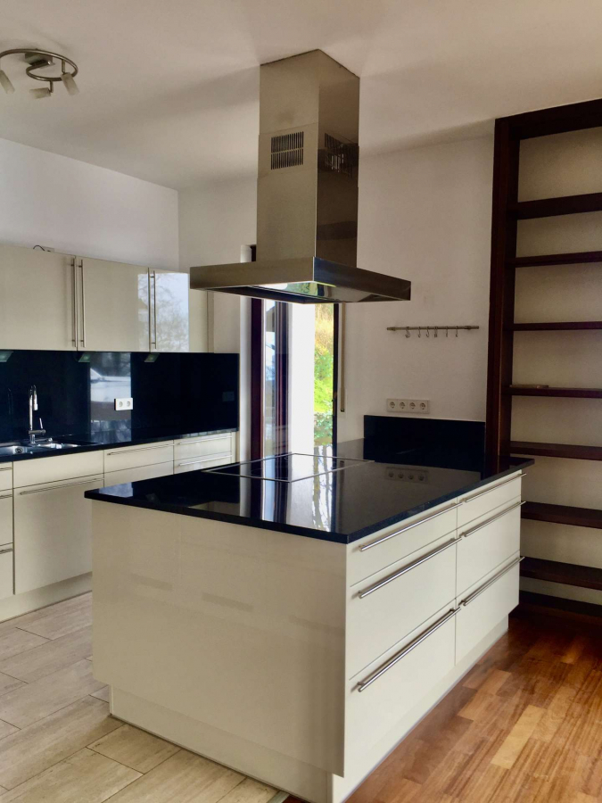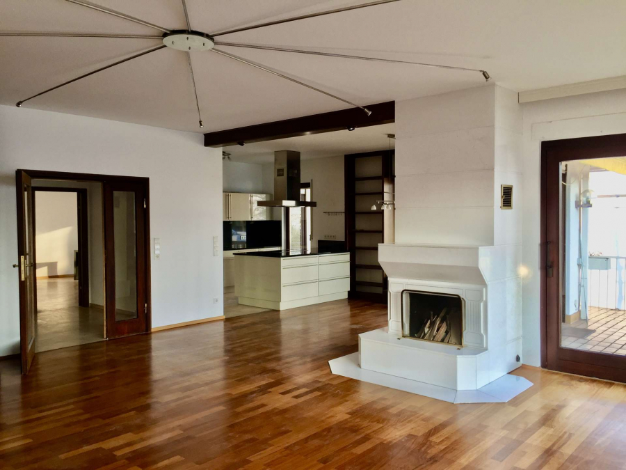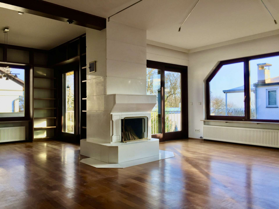 Das Eingangsgeschoss des Hauses erstreckt sich über einen schönen hellen Entreebereich, der in das große und repräsentative Wohnzimmer mit einem offenen Marmorkamin führt. Angrenzend befindet sich ein Essbereich mit einer modernen und offen gestalteten Einbauküche. Sowohl vom Wohn- und Essbereich als auch von der Küche gelangt man auf die Terrasse, die ebenso über einen Treppenzugang in den Garten verfügt.