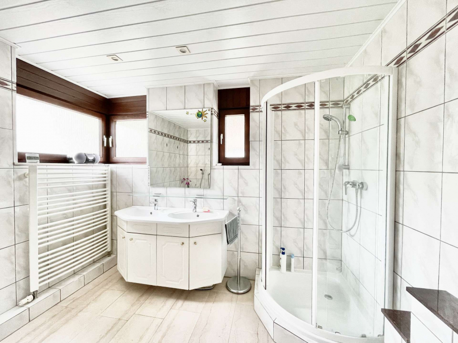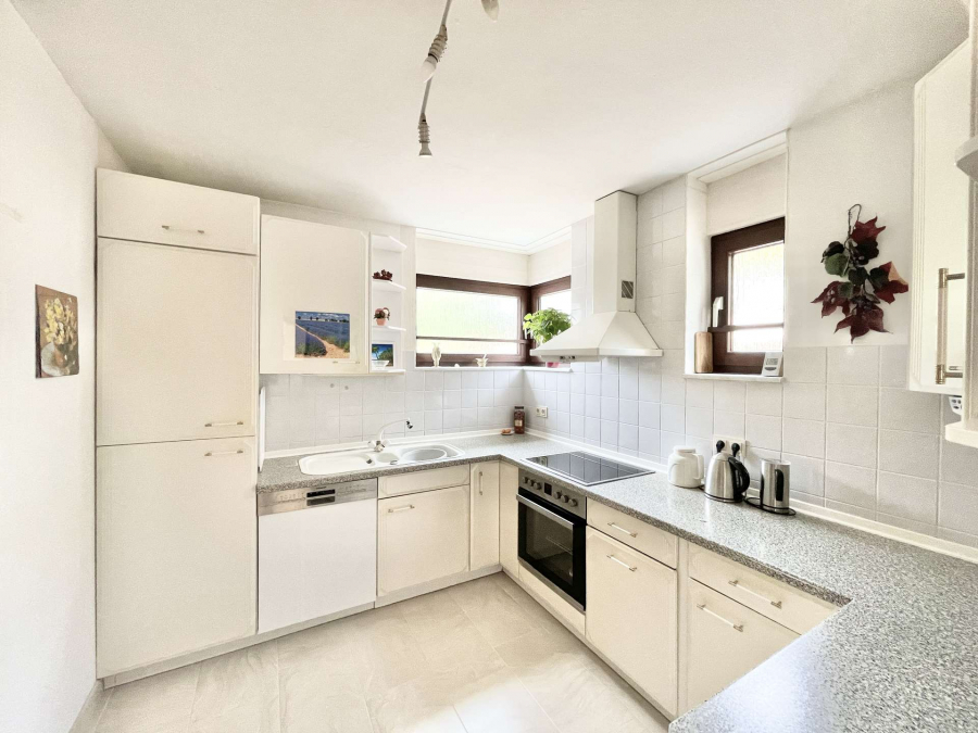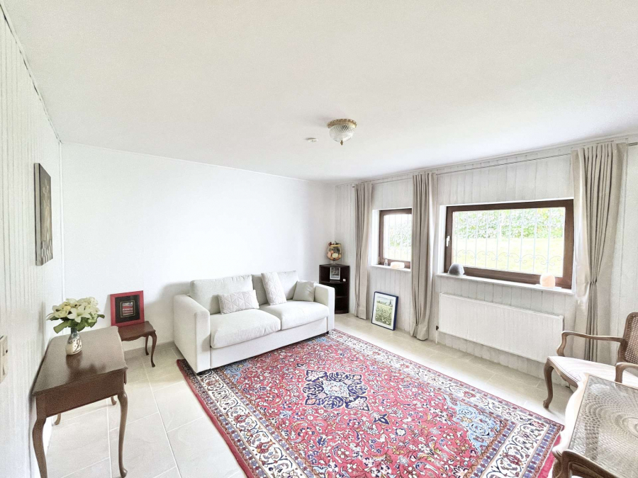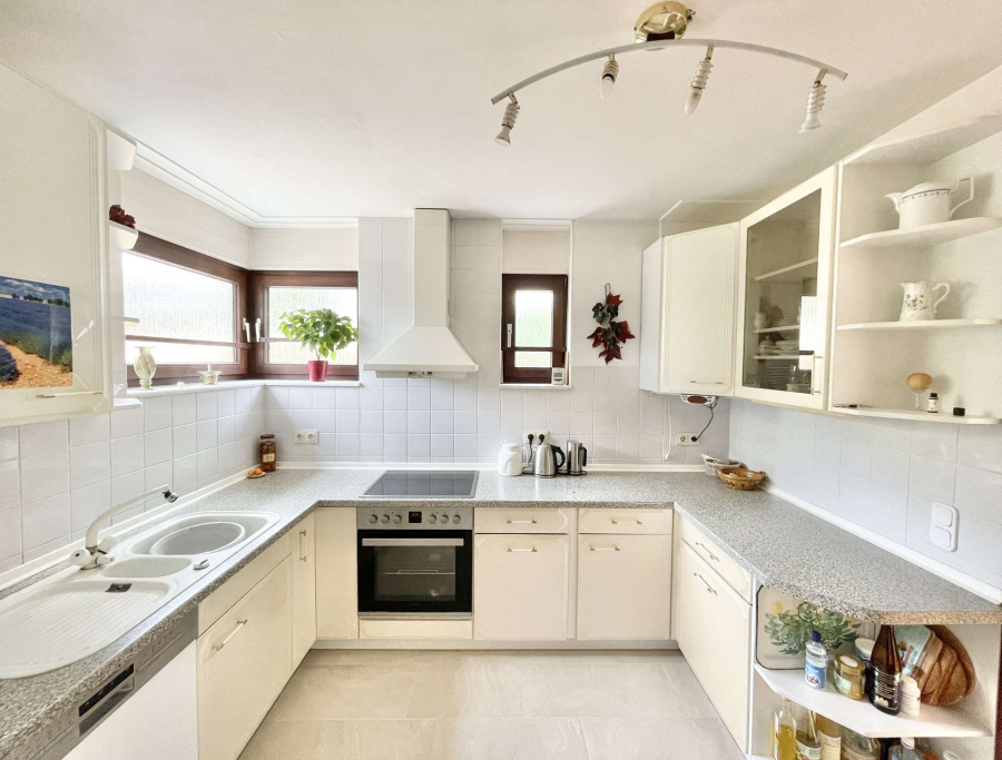 Im Erdgeschoss befindet sich ein großes helles Wohnzimmer mit bodentiefen Fenstern, angrenzendem Essbereich, eine geräumige Küche und eine Diele mit einem Einbauschrank. Vom Wohnzimmer gelangt man auf die großzügige Südterrasse mit ca. 28 Quadratmetern sowie in den aufwändig und terrassenförmig angelegten Garten.