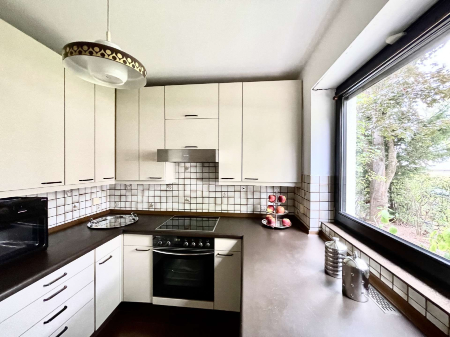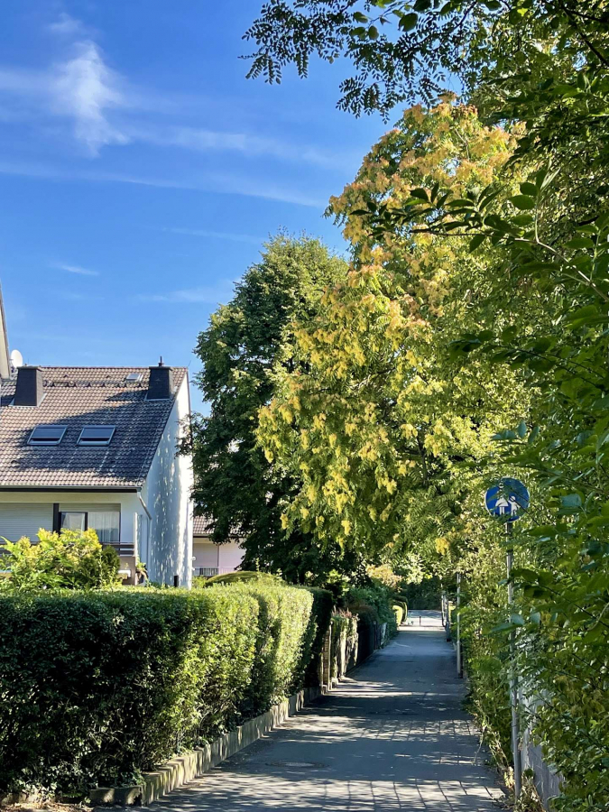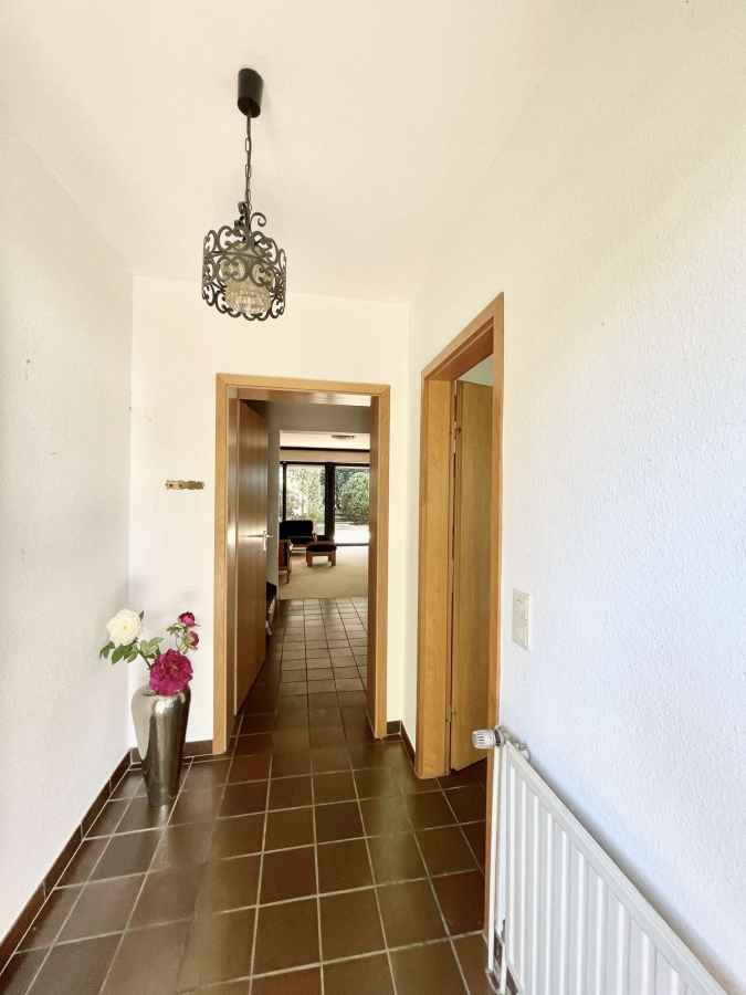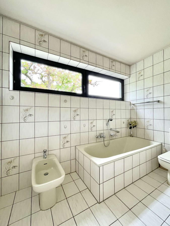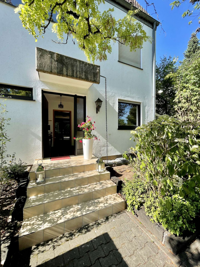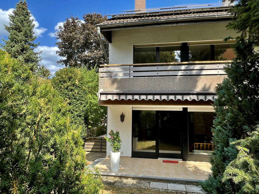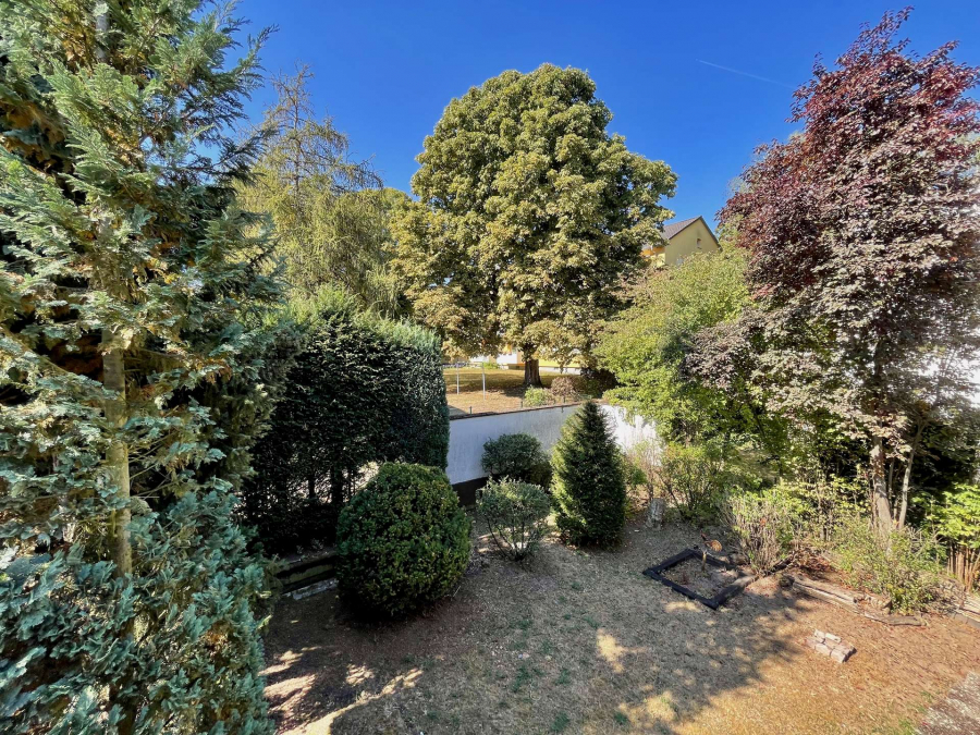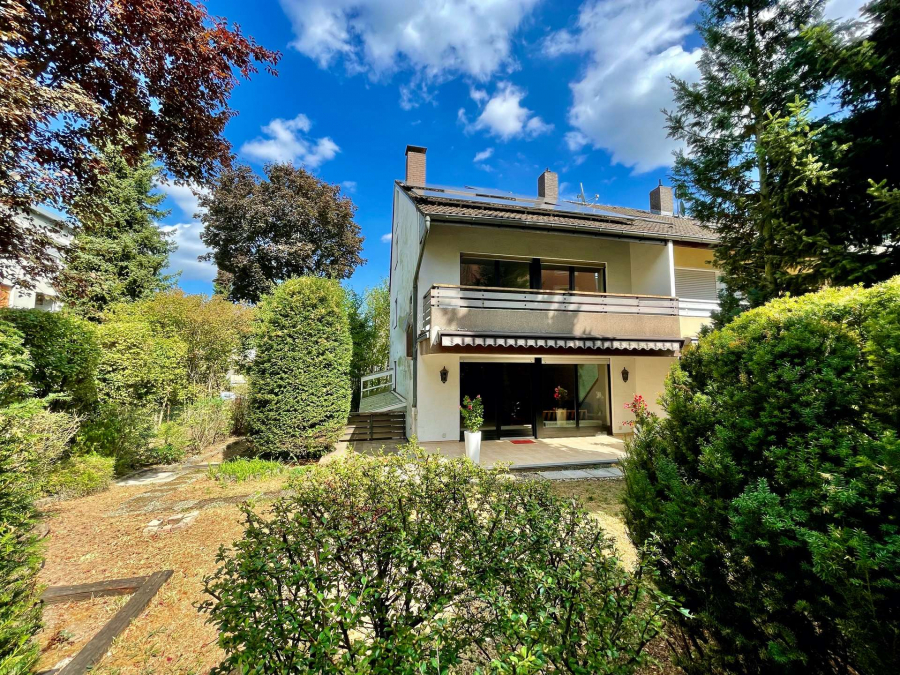 Das Haus erstreckt sich im Erdgeschoss über einen Eingangsbereich mit einem Gäste-WC, einem Flur, einer Küche und einem lichtdurchfluteten Wohnzimmer mit Essbereich, von dem man auf die neu geflieste Terrasse und in den schön eingewachsenen Garten gelangt. Im Obergeschoss befinden sich drei Schlafräume, zwei davon verfügen über einen Zugang auf den Südwest-Balkon. Ein großes Tageslichtbad mit einer Badewanne ist ebenso auf dieser Etage zu finden. Von allen Zimmern kann man den Ausblick auf einen schönen Baumbestand genießen.