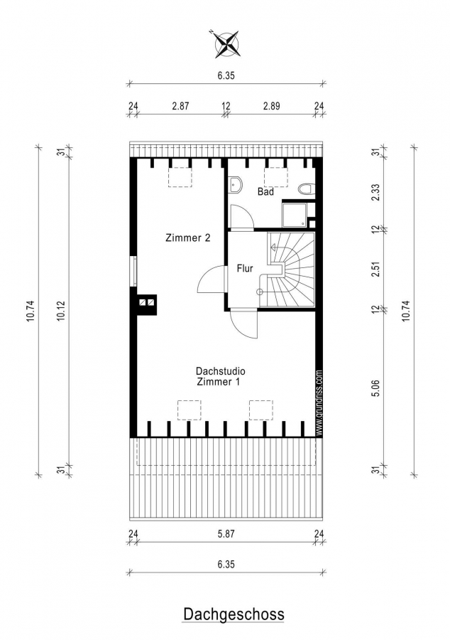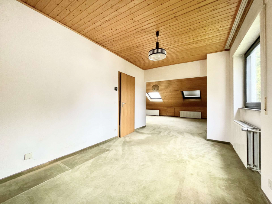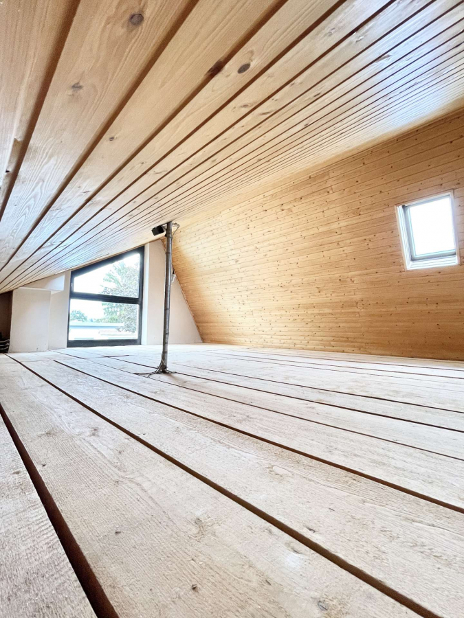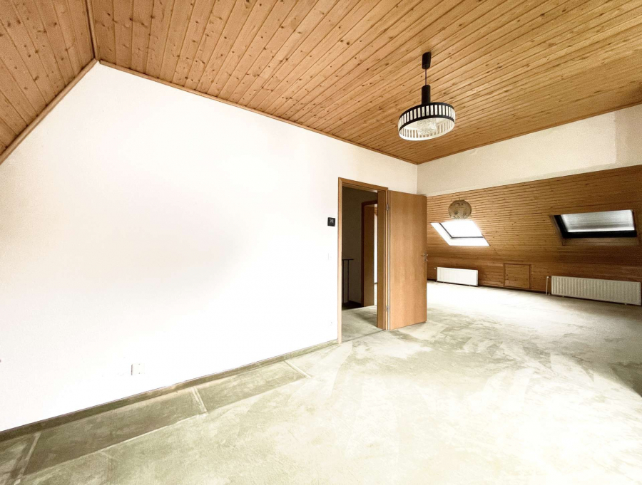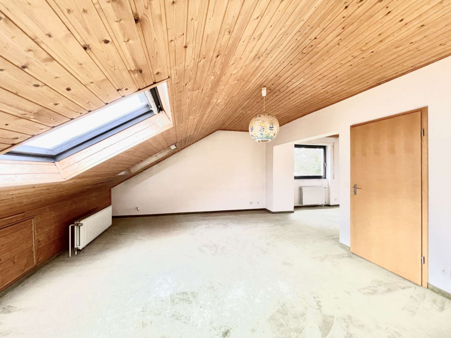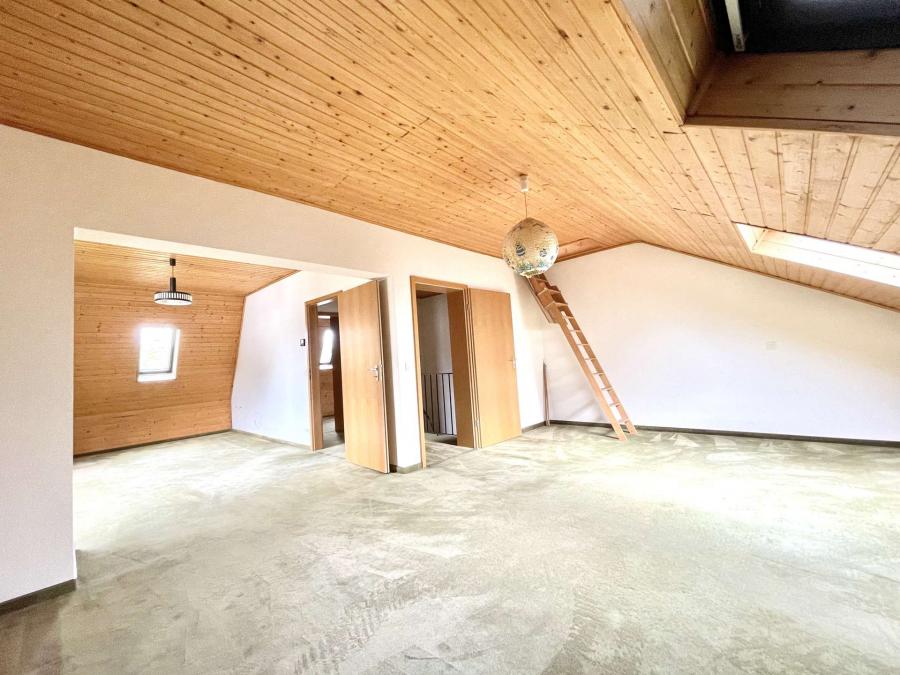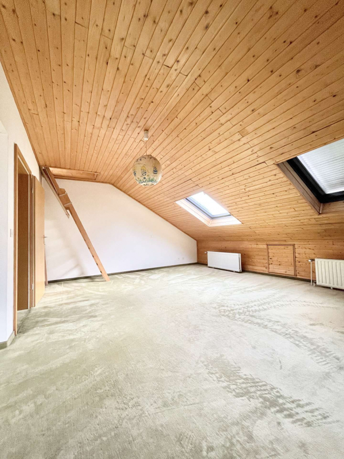 Das Dachgeschoss verfügt über ein großes Dachstudio von ca. 36 m², das man optional in zwei Räume aufteilen könnte. Ein aktuell nicht ausgebautes Duschbad rundet das Wohnkonzept auf dieser Etage ab. Der darüberliegende gut belichtete Spitzbogen mit zwei Fenstern könnte problemlos z.B. in ein Spielparadies für Kinder ausgebaut werden.