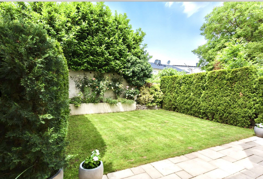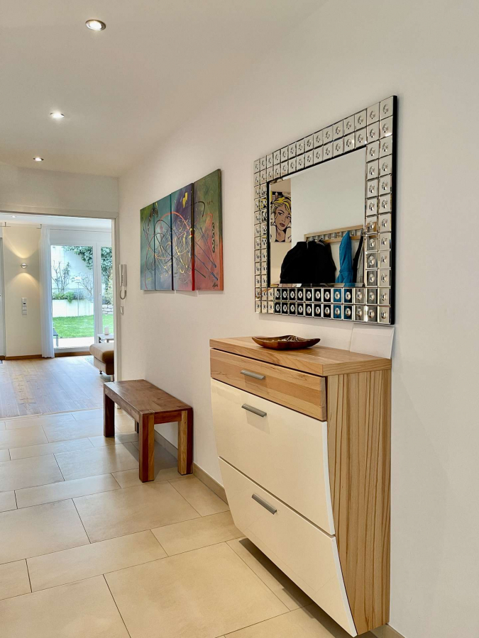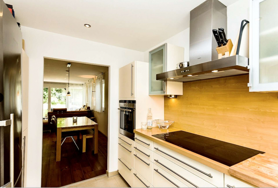 Das Erdgeschoss erstreckt sich über eine großzügige Diele, die über eine Flügeltür in das schöne, zum Garten ausgerichtete Wohnzimmer mit angrenzendem Essbereich führt. Eine hochwertige Einbauküche lässt das Herz aller Hobbyköche höher schlagen. Ein modernes Gäste-WC und eine Abstellraum stehen ebenso im Erdgeschoss. zur Verfügung.
