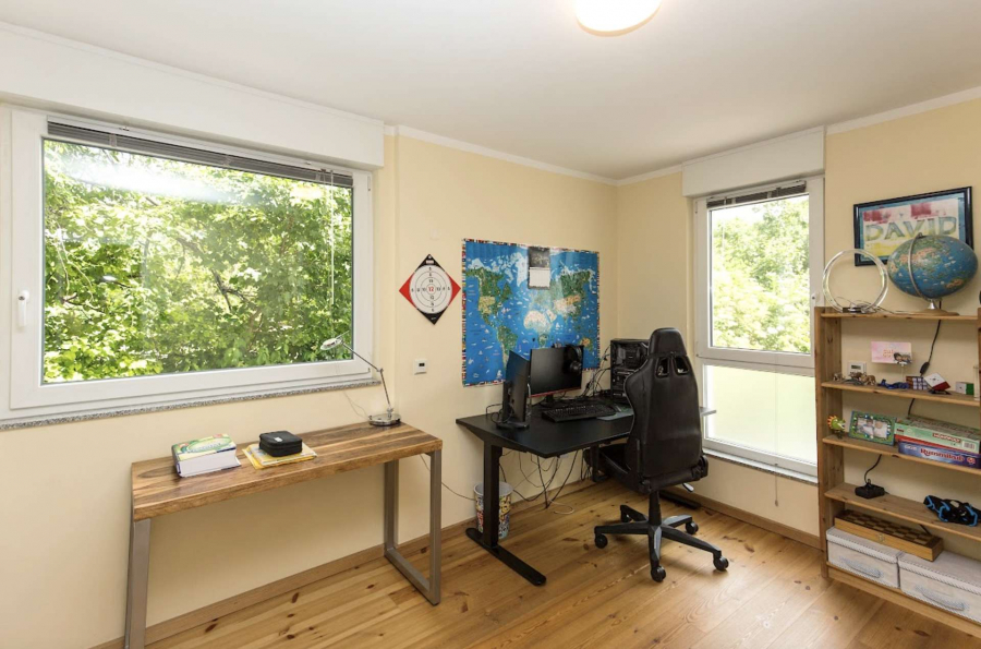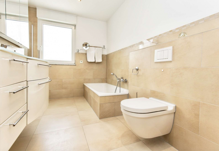 Eine gut begehbare Treppe führt in das Obergeschoss. Dort befinden sich zwei Schlafzimmer sowie ein weiterer Raum, der bestens als Ankleide oder Arbeitszimmer genutzt werden kann. Ein weiteres Highlight stellt das geräumige Masterbad auf dieser Etage dar.