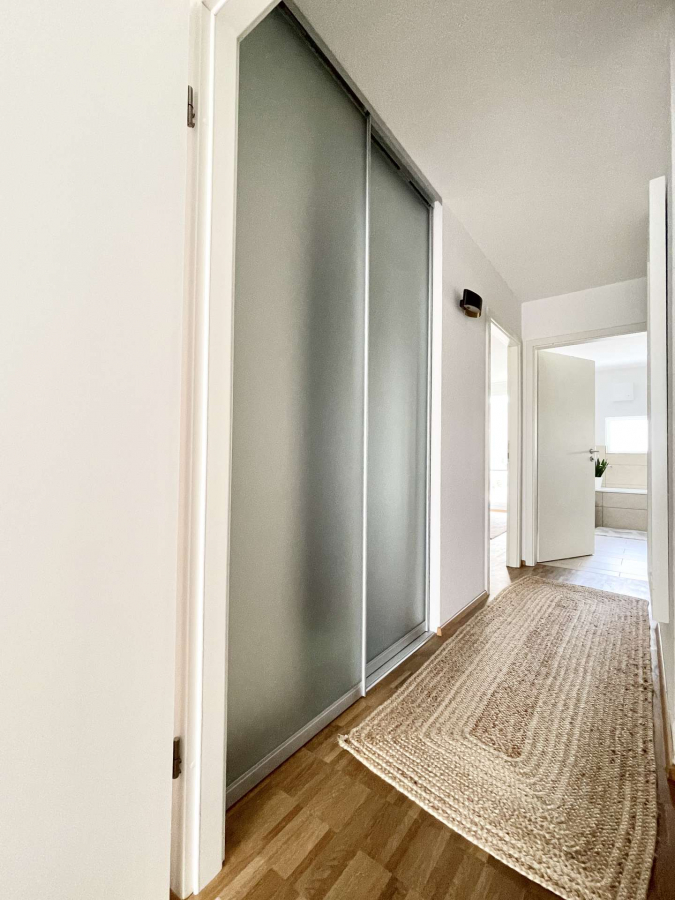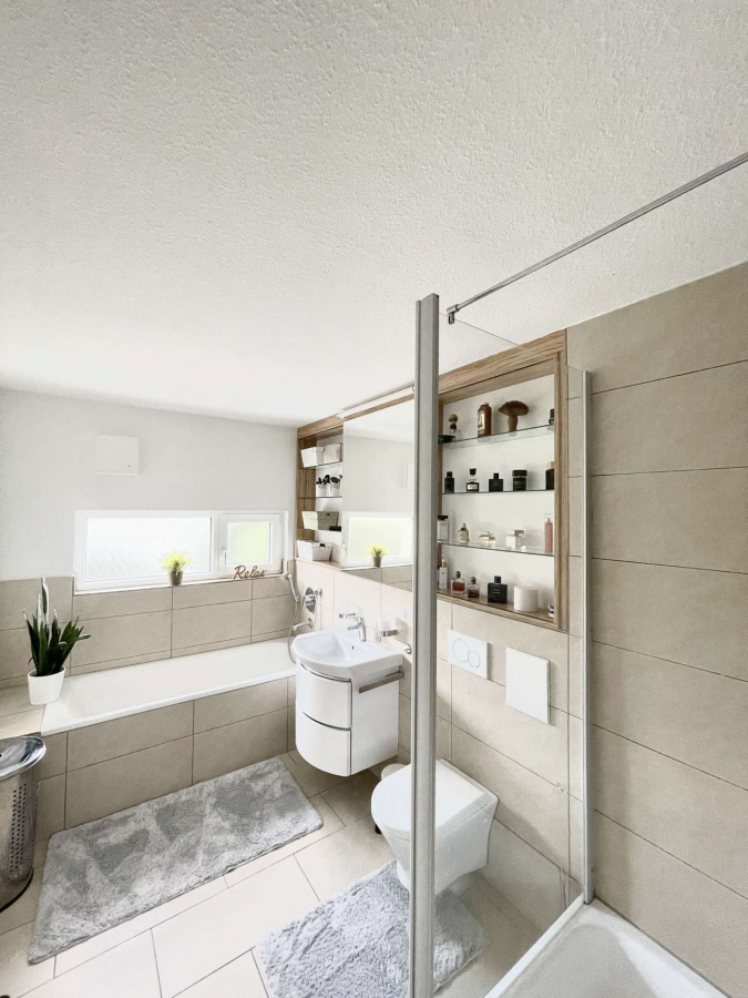 Eine gut begehbare Treppe führt in das Obergeschoss. Dort befinden sich zwei Schlafzimmer sowie eine eingebaute Ankleide mit satineirter Glasschiebetür. Ein weiteres Highlight stellt das geräumige und stylische Tageslichtbad auf dieser Etage dar.