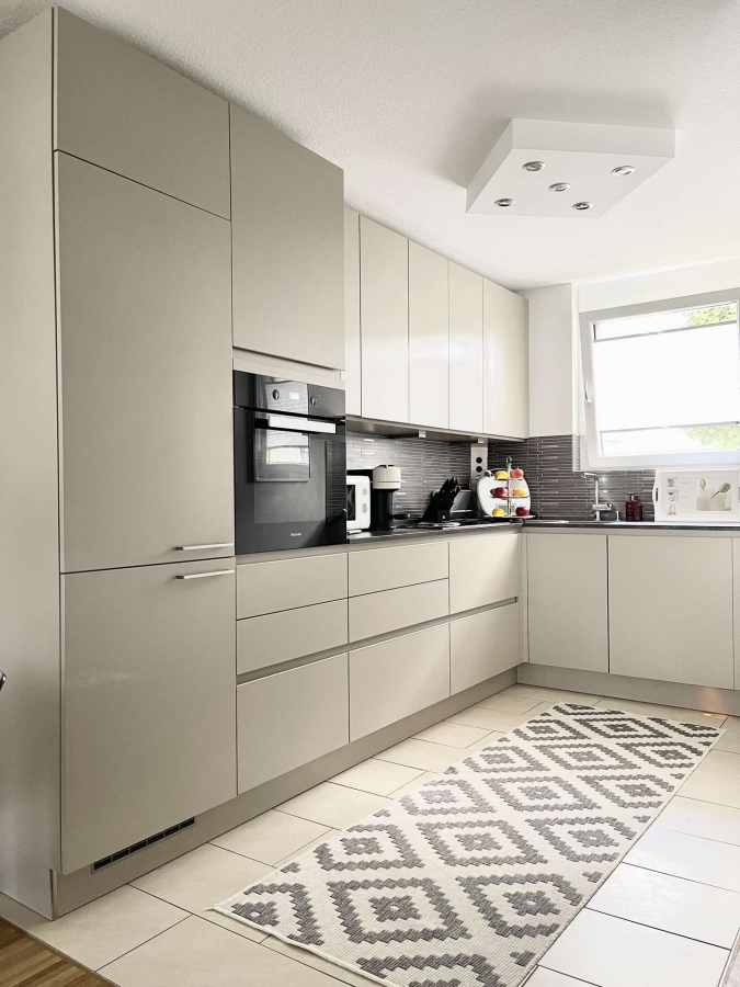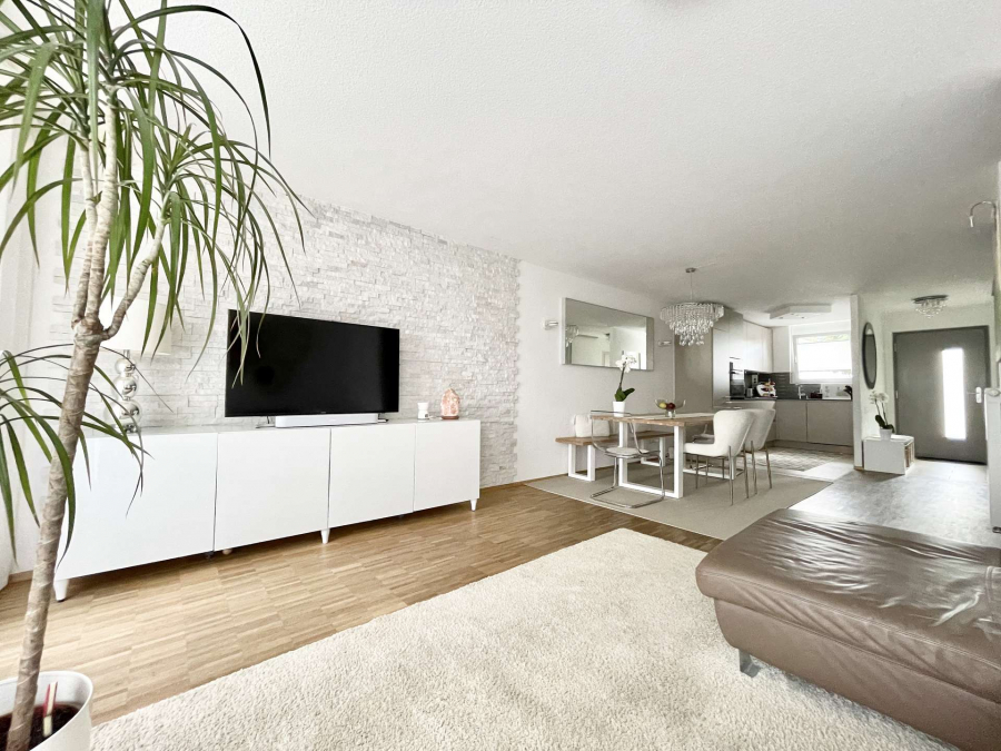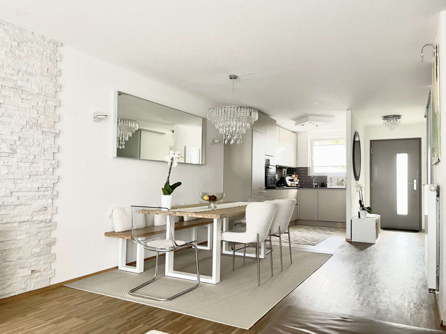 Das Erdgeschoss erstreckt sich über einen Flur, einer offen gestalteten Küche mit einer exklusiven Einbauküche , einen angrenzenden Ess- Wohnbereich und einem Gäste-WC. Vom Wohnzimmer gelangt man auf die überdachte Süd-Terrasse, die zum Verweilen einlädt und den Garten.