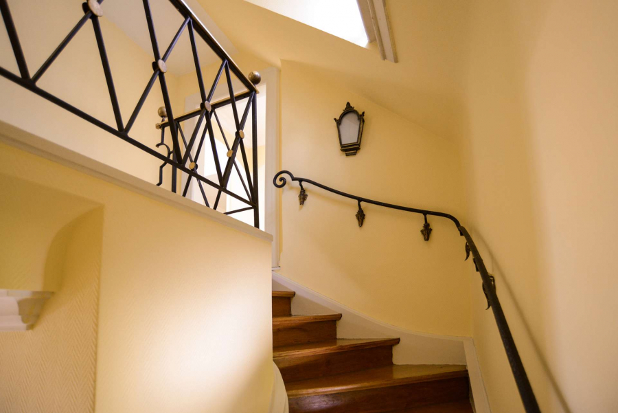 Über eine geschwungene Holztreppe gelangen Sie in das Obergeschoss. Dort befindet sich ein Schlafzimmer mit einem Tageslichtbad en Suite und einer überaus charmanten Terrasse mit Blick in die Baumkronen des alten Baumbestands auf dem Grundstück. Ein weiterer kleinerer Schlafraum grenzt an das Schlafzimmer an und könnte auch als Ankleide dienen.