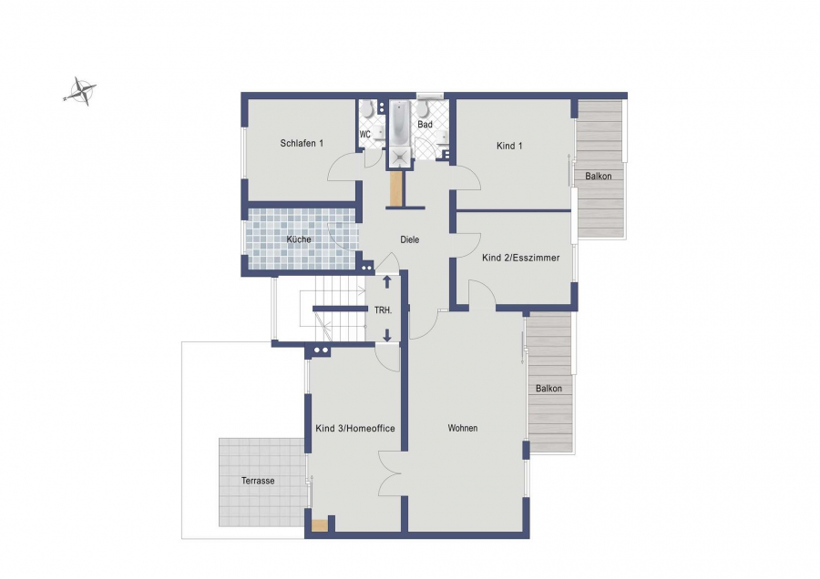 Des Weitern gelangt man von der Diele durch zwei jeweils keine Flure, die Platz für eine Garderobe und einen Einbauschrank bieten, in zwei große Schlafzimmer, wovon ein Raum über den zweiten tollen Südbalkon mit Fernblick verfügt. Neben dem nach Norden ausgerichteten Schlaf- oder Kinderzimmer befindet sich ein Gäste-WC und neben dem nach Süden ausgerichteten Schlafzimmer ein Tageslichtbad mit einer Dusche sowie einer Badewanne. Ein weiteres Schlaf- ,Kinderzimmer oder Homeoffice ist von der Diele zu erreichen, ebenso die Küche.