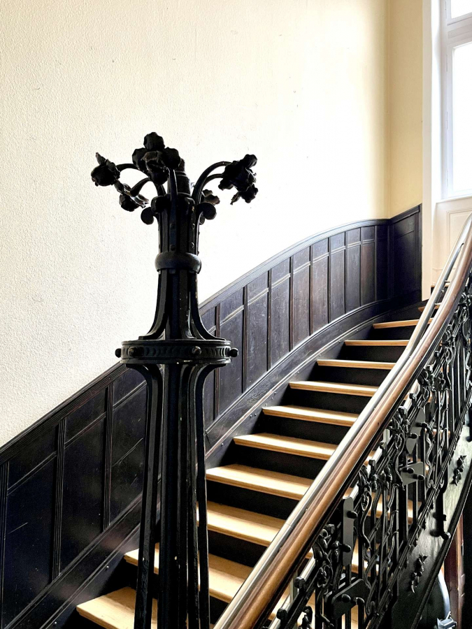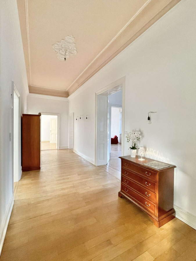 Vom Treppenhaus aus verfügt diese Etage über einen Haupteingang und einen zweiten Eingang, der direkt in die großzügige Küche führt. Der geräumige Flur, der sich wunderschön möblieren lässt, dient als zentraler Knotenpunkt, von dem aus alle Räume zu erreichen sind. Auf der rechten Seite der Wohnung befindet sich der herrschaftliche Wohnbereich, der aus drei Zimmern besteht, die mit geöffneten Schiebetüren ineinander übergehen oder auch einzeln genutzt werden können. Ein bestechendes Highlight stellen die reich verzierten Stuckdecken in diesen Räumen dar. Eines der Zimmer verfügt über einen hübschen Runderker und einen angrenzenden Balkon, ein anderer Raum über einen Kamin. Von allen Räumen hat man einen sehr schönen Ausblick in die Baumkronen und auf die umliegenden Stadtvillen.