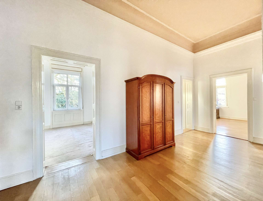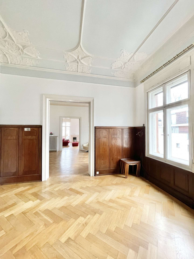 Die helle Eigentumswohnung besticht durch Ihren herrschaftlichen Grundriss, der sich über die komplette erste Etage dieses Altbaus erstreckt. Schon beim Betreten der Wohnung verspürt man den Charme des Objekts und kann sich an den historischen Stilelementen, wie die reich verzierten Stuckdecken, dem Kamin, den Kassettentüren mit original Beschlägen sowie das massive Fischgrät-Parkett erfreuen.