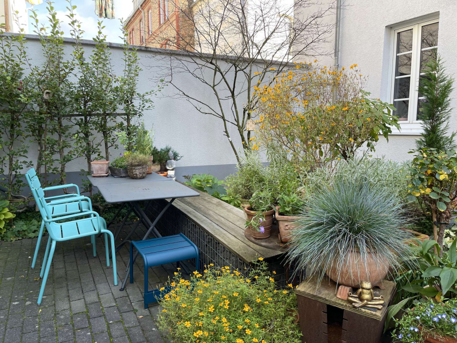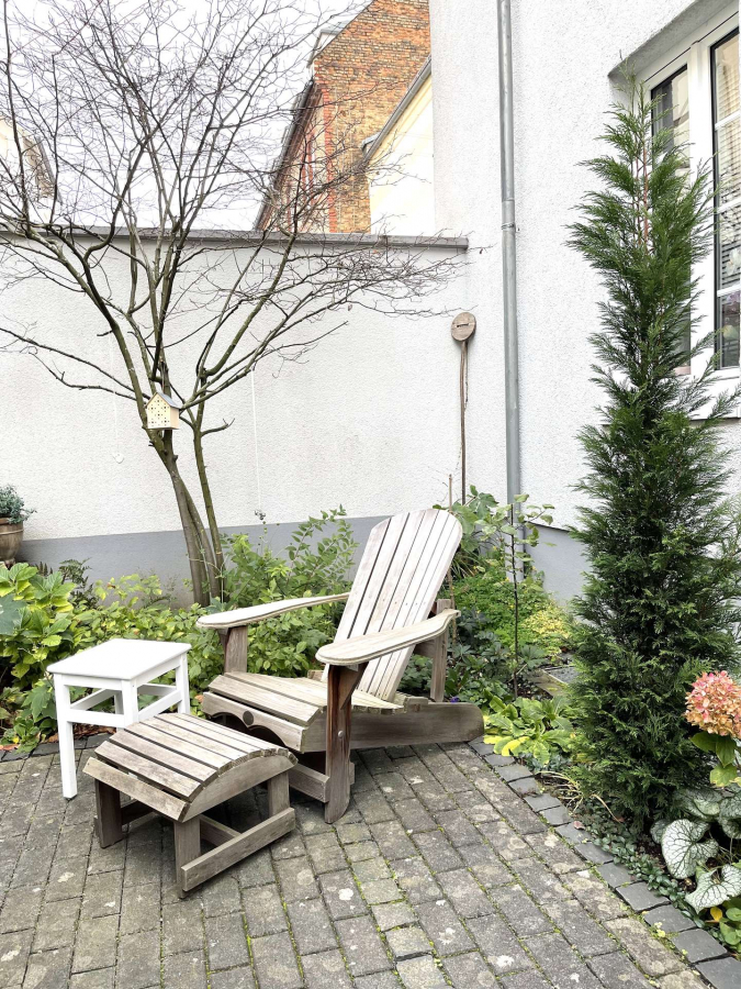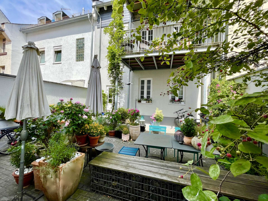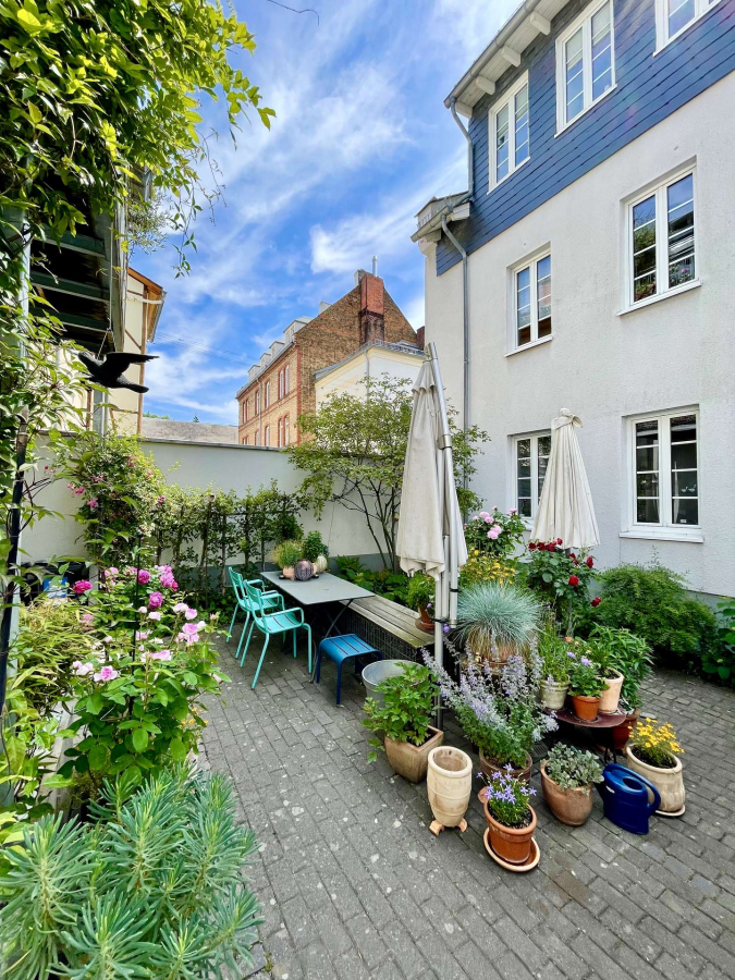 Ein wunderschön gestalteter Innenhof mit Sitzgelegenheiten steht zur Mitbenutzung zur Verfügung und lädt zum Verweilen ein.